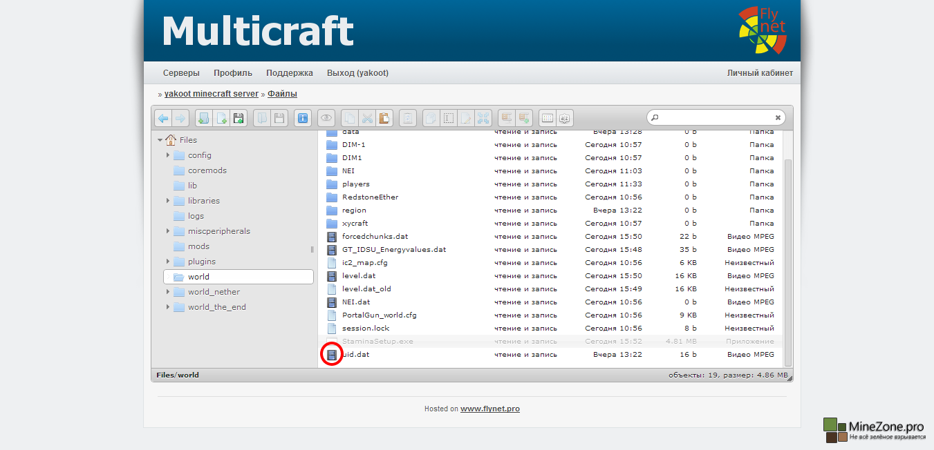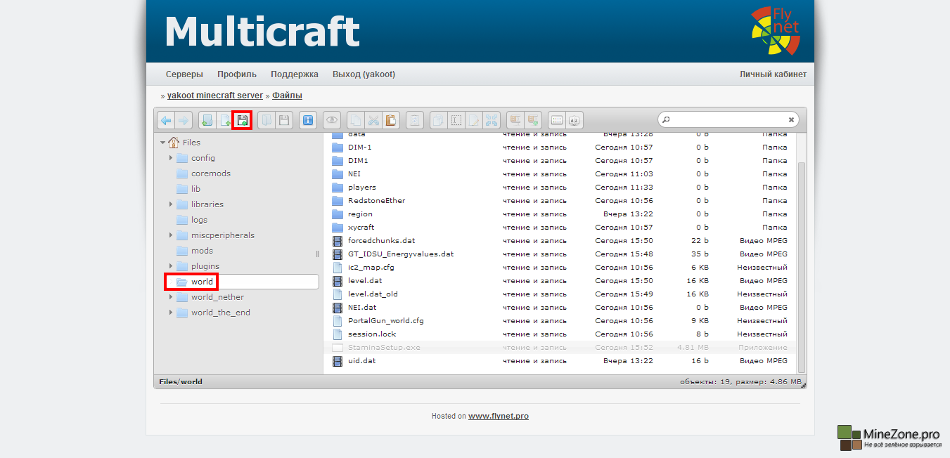 3. Находим папку World, открываем и закачиваем именно туда. В открывшемся файловом менеджере нажимаем Загрузить файлы (дискетка). Выбираем файл, Закачиваем.