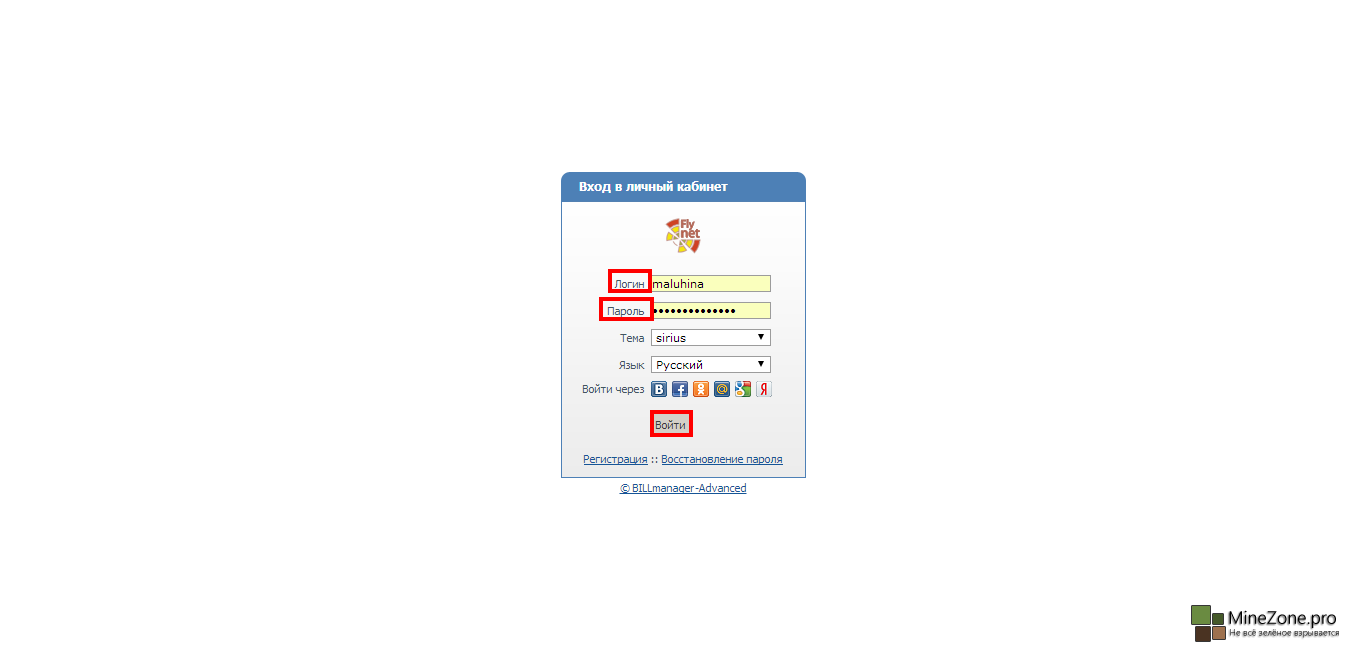 1. Авторизуемся в личном кабинете (bill.flynet.pro) с логином и паролем указанными при регистрации. Если не помните пароль или логин - жмем ссылку Забыли пароль.