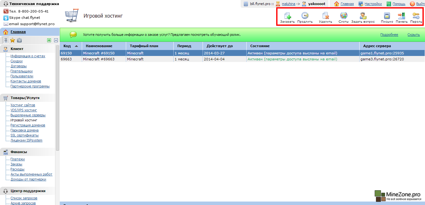 2. После авторизации попадаем в личный кабинет. Сперва глаза разбегаются от множества элементов. Не пугаемся. Для управления игровым сервером Minecraft переходим в пункт Товары/Услуги - Игровые серверы. Видим свой заказ. Для совершения действий над сервером - выделяем строку с заказом. Вверху справа активируются кнопки.