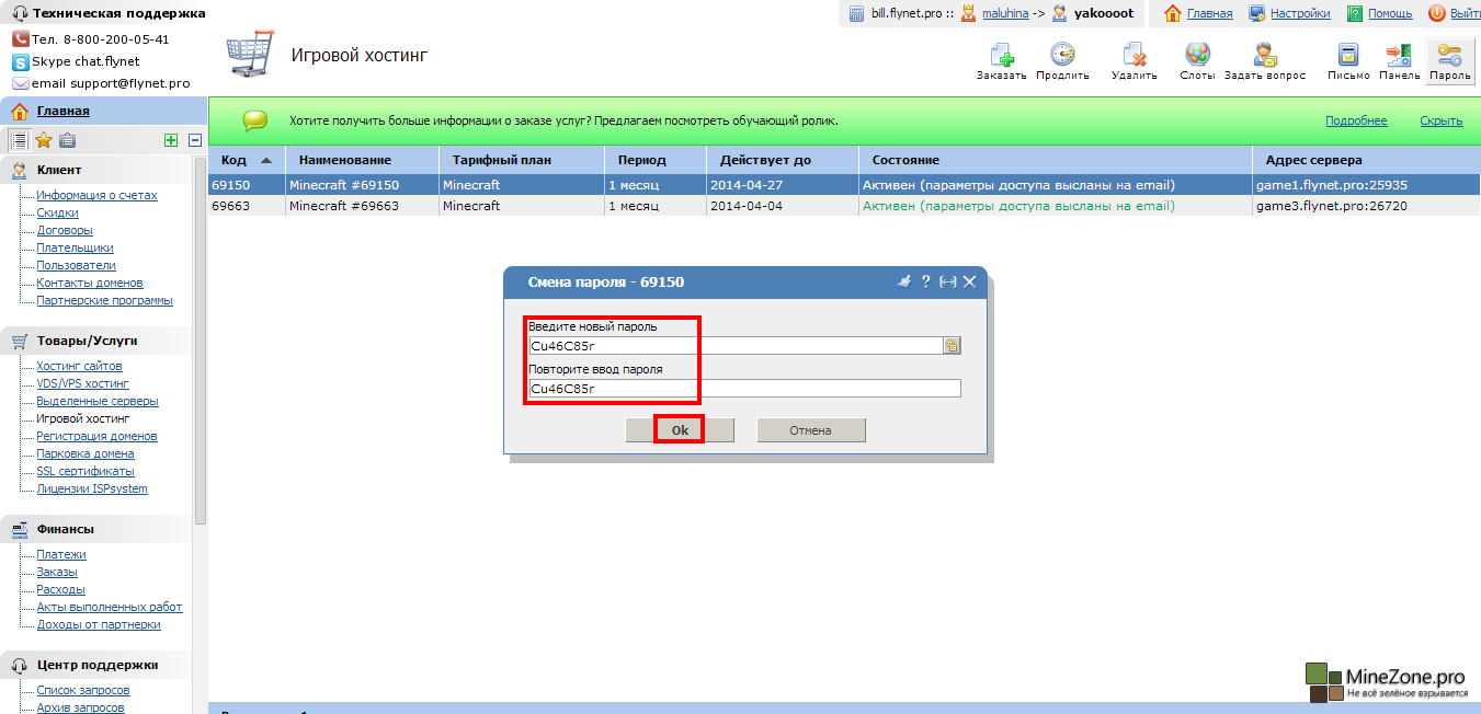7. Пароль. Позволяет сменить пароль в панель управления игровым сервером (mygame.flynet.pro). В личный кабинет (bill.flynet.pro) пароль останется прежним.