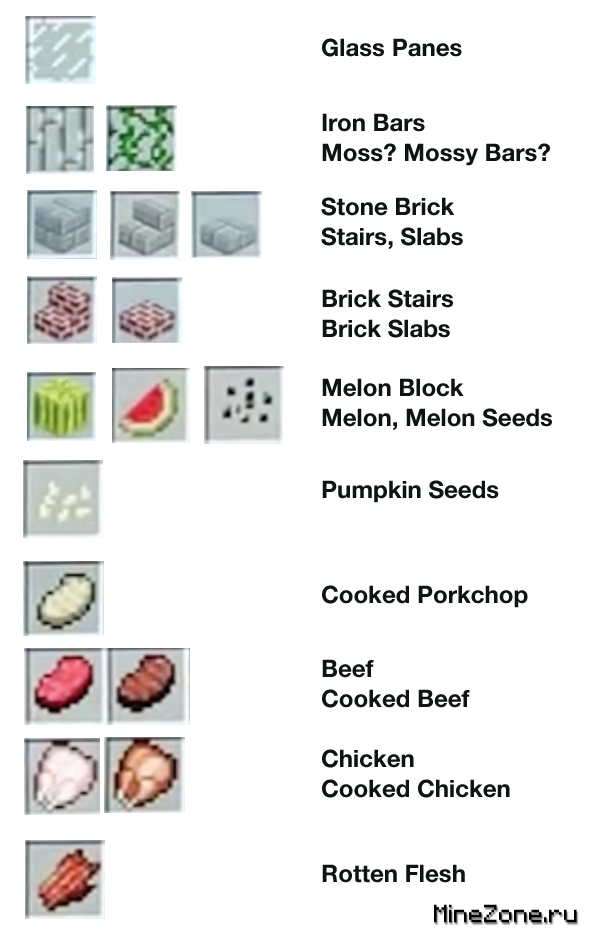 -Крепости состоящие из 4 новых блоков: каменный кирпич, замшелый каменный кирпич, потресканный каменный кирпич и железная решетка.
