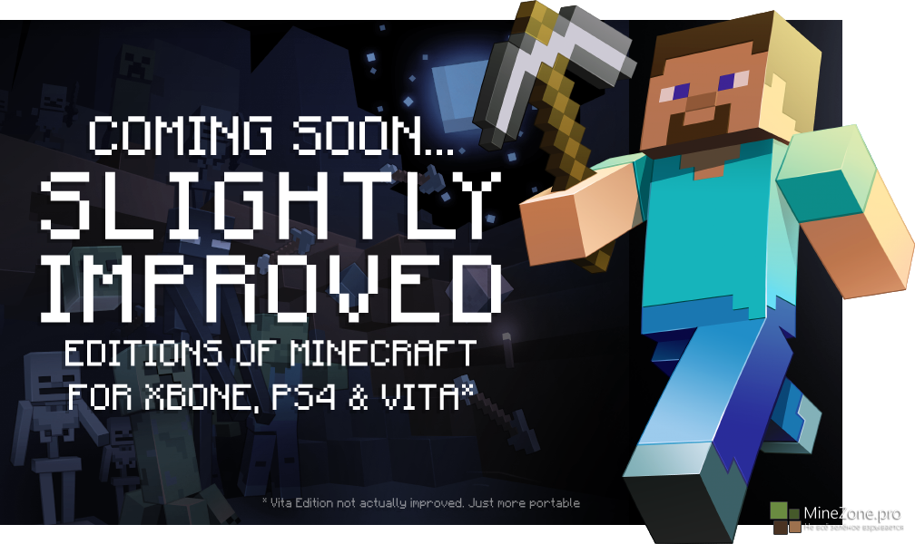 Напомним, что специальная версия Minecraft для консолей нового поколения (Xbox One, PS4) была анонсирована в рамках Gamescon 2013 в конце прошлого года. Тогда же была заявлена поддержка и портативной консоли от Sony - PSVita. Сегодня, спустя продолжительное время, появилась информация об этих релизах.