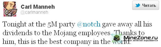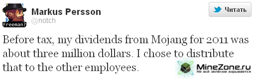 На днях Нотч выложил очень необычное сообщение в твиттере: «До вычета налогов, мои дивиденты от Mojang за 2011 год составили порядка трёх миллионов долларов. Я решил поделить эти деньги между своими сотрудниками.» Ссылка.