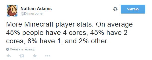 | «В среднем, у 45% игроков 4-х ядерные процессоры, еще 45% имеют по 2 ядра, 8% - по одному и на 2% приходится другое» |
